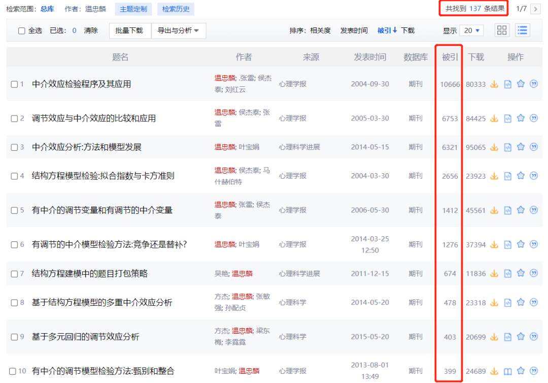 查詢顯示,溫忠麟共有137篇論文被知網收錄,多篇論文成為知網“爆款”。